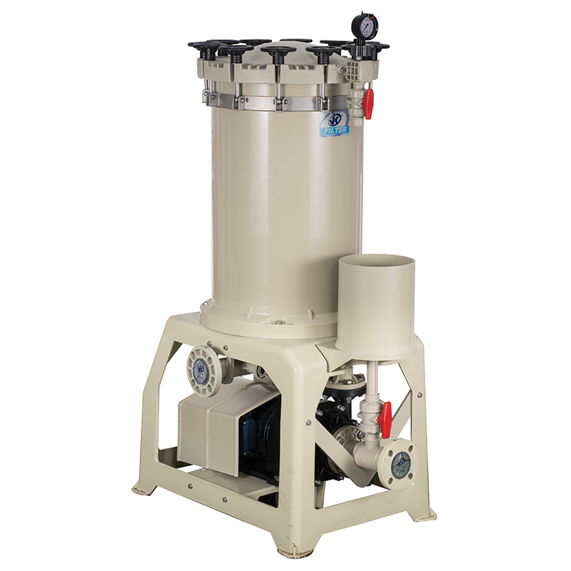 電鍍過濾機主要用于化學藥液內雜質及顆粒的過濾。過濾機工作時,通過過濾機下面的泵浦電機動力將藥液輸送進過濾桶,再經過過濾機中的濾材吸附藥液中的顆粒及雜質,將過濾后的藥液經濾芯中的濾管流入槽中循環使用。