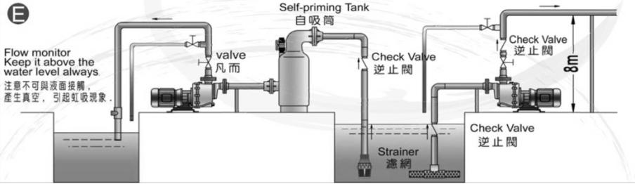 泵的自吸高度隨葉輪的圓周速度U2的增大而增大,但到最大自吸高度時,轉數增加而自吸高度就不再增加了,此時只是縮短自吸時間;當轉數下降時,自吸高度則隨著下降。在其它條件不變的情況下,自吸高度還隨著儲水高度的增加而增加(但也不能超過分離室的最佳儲水高度)。為了在自吸泵中更好地使氣水混合,葉輪的葉片須少些,使葉柵的節距增大;并宜采用半開式葉輪(或葉輪槽道較寬的葉輪),這樣更方便于回水深入地射進葉輪葉柵中。應盡量避免將自吸泵裝設于戶外。若必需安裝于戶外時,應覆蓋保護蓋,若泵浦配備有電子控制器時,則需加以保護。