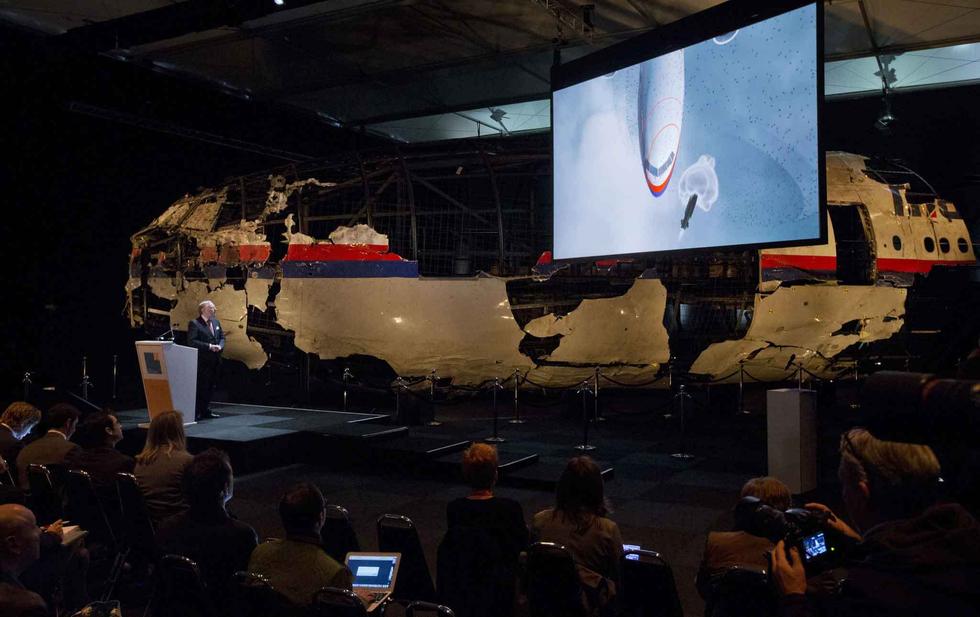 發(fā)布會(huì)現(xiàn)場(chǎng),荷蘭調(diào)查人員展示了MH17航班前半截殘骸的重組。當(dāng)扭曲且布滿彈孔的客機(jī)殘骸出現(xiàn)在眼前時(shí),現(xiàn)場(chǎng)媒體記者一片沉寂。