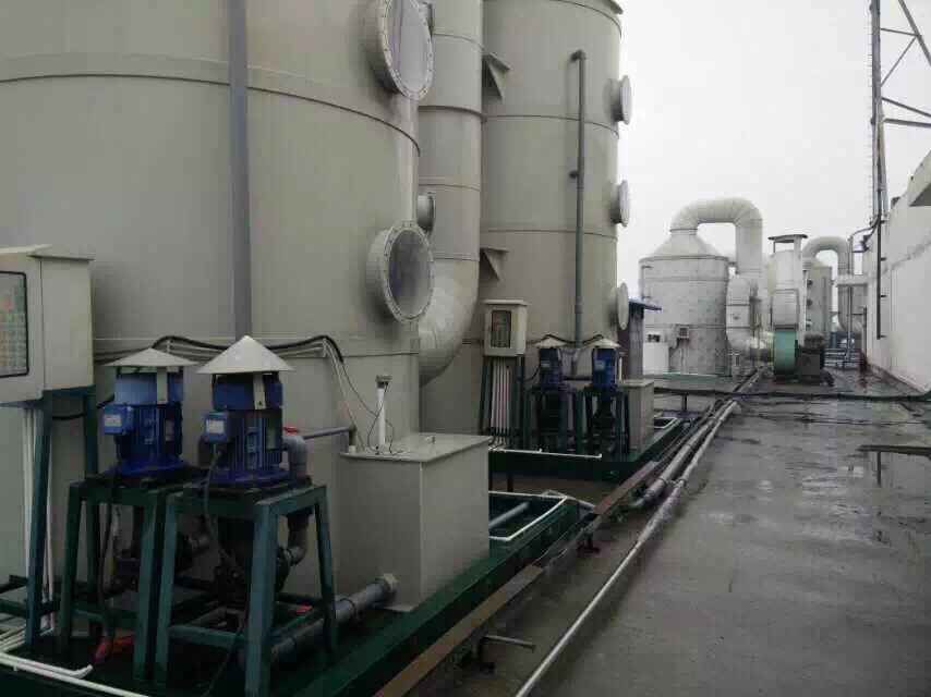 廢氣洗滌塔,也叫酸霧凈化塔,廢氣經由填充式洗滌塔,采用氣液逆向吸收方式處理,即液體自塔頂向下以霧狀(或小液滴)噴撒而下。廢氣則由塔體(逆向流)達到氣液接觸之目的。此處理方式,可冷卻廢氣、調理氣體及去除顆粒,再經過除霧段處理后,排入大氣中。
