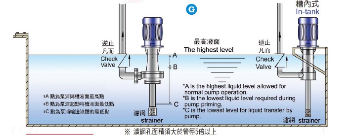 9、出口配管高度如有高過馬達以上或有逆壓之情形時,請在泵浦出口處裝置逆止閥,裝置位置請勿超過最高液面線太多。