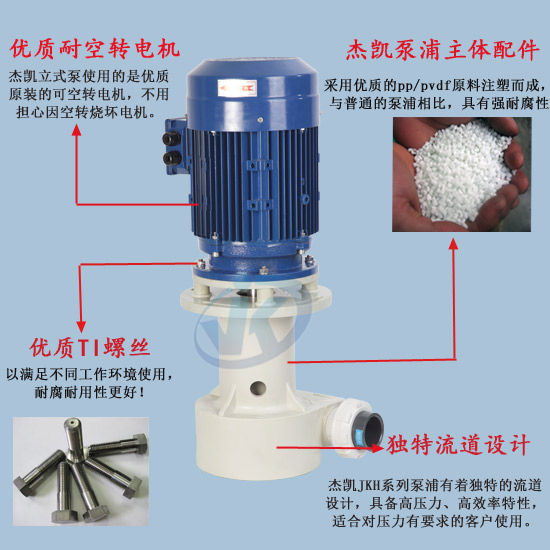 杰凱JKH 高壓耐酸堿立式泵 1-10HP使用范圍廣,適合各種酸堿液循環、冷卻、噴洗設備,廢氣塔、蝕刻機、化學鍍、無電解鎳等特殊場合;適合于槽內安裝使用,可配合過濾機使用。
