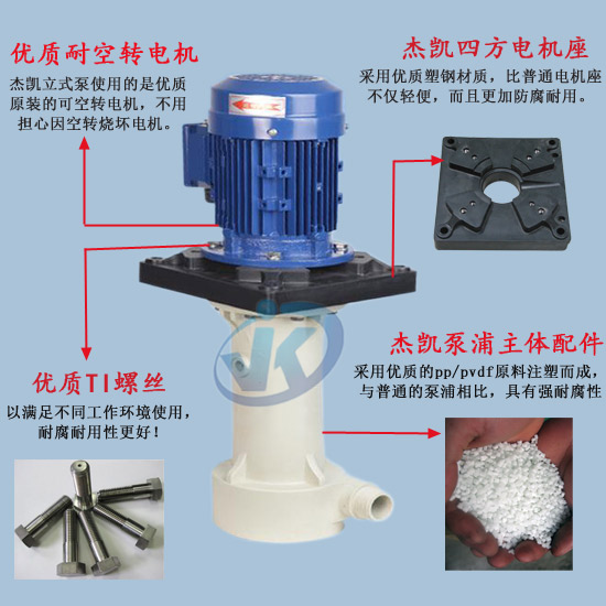 3、JKT 耐酸堿液下泵適合各種酸堿液循環(huán)、冷卻、噴洗設(shè)備,廢氣塔、蝕刻機(jī)、化學(xué)鍍、無電解鎳等特殊場(chǎng)合;